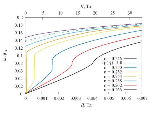 Рис. 2. Зависимости намагниченности от магнитного поля при различных значениях концентрации при 𝑈 =1.50 𝑡, 𝑇 = = 2⋅10−4𝑡 для τ = −0.52. Пунктиром обозначена кривая соответствующая значению 𝑛, при котором выполняется критерий Стонера (14). Для оценки величины магнитного поля ширина зоны 𝑊 =18𝑡 выбиралась равной 5 эВ.