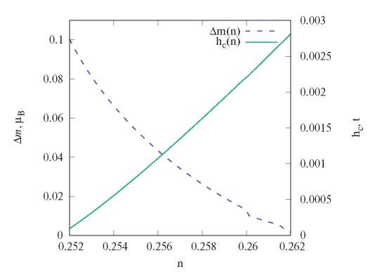 Рис. 3. Фазовая диаграмма в переменных ℎс − 𝑛 и Δ𝑚 − 𝑛 𝑈 = = 1.50𝑡, 𝑇 = 2⋅10−4𝑡, сплошная линия разделяет две фазы, снизу — парамагнитная, сверху — ферромагнитная.