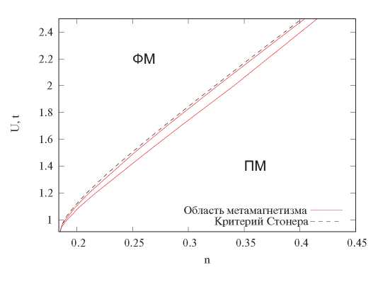 На ней область, ограниченная красными кривыми, соответствует области зонного метамагнетизма; пунктиром обозначена кривая, отвечающая параметрам 𝑈 и 𝑛, для которых выполняется критерий Стонера. Сверху от области метамагнетизма лежит область ферромагнетизма (ФМ), ниже — парамагнетизма (ПМ). Метамагнетизм наблюдается для параметров 𝑈 и 𝑛, при которых критерий Стонера близок к выполнению, но не выполнен. Концентрационный интервал, в котором наблюдается метамагнитный переход, существенно зависит от 𝑈: на рис. 4 представлен интервал , для которого концентрационный интервал оказывается достаточно широким, с увеличением параметра 𝑈 область существования метамагнетизма постепенно сужается.