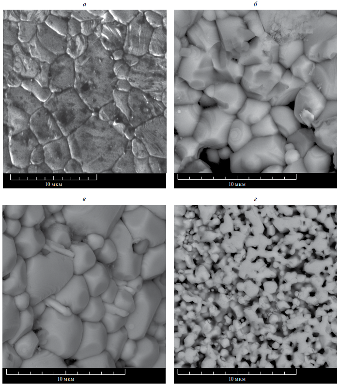 Рис. 1. СЭМ-микрофотографии поверхности манганитов, содержащих (Fe, Sc) (а), (Ni, Ge) (б), (ZnGe) (в), (Mg, Ge) (г).