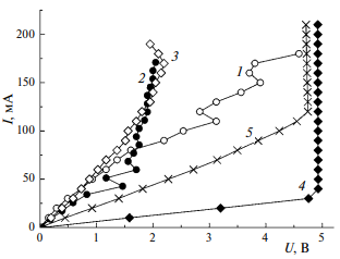 Вольтамперная характеристика (Ni, Ge)-содержащего манганита (рис. 4) имеет два S-образных участка при 260 К (область полупроводникового типа проводимости, T > Tms). При T ≤ 140 К (область металлического типа проводимости, T < Tms) ВАХ близки к линейным.