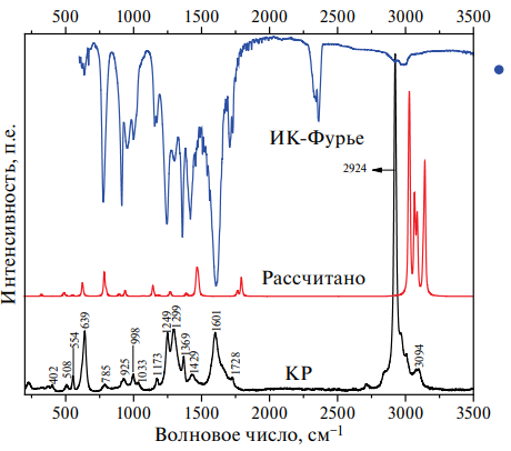 Рис. 1. Спектры КР (экспериментальный и расчетный) и ИК-Фурье чистого ацетилацетона.