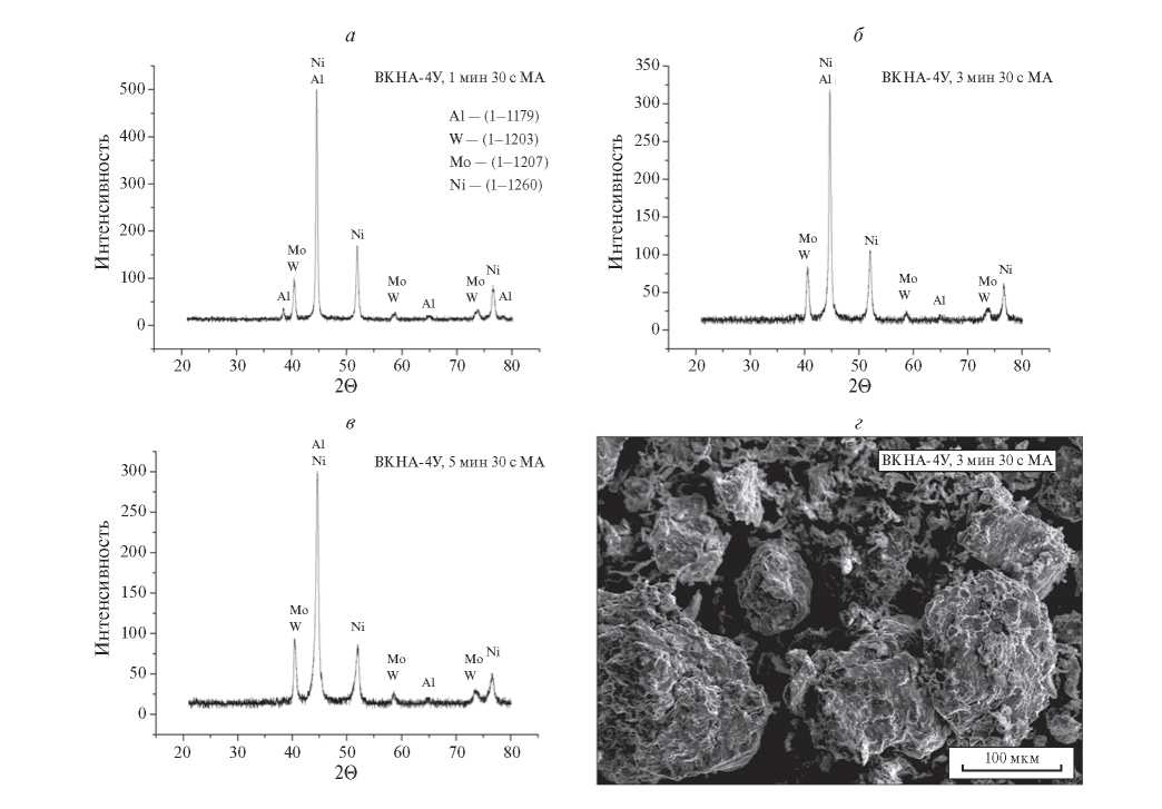 Как было отмечено ранее, механическую активацию порошковых смесей, по химическому составу соответствующих сплавам на основе алюминида никеля, выполняли при различных временах активации. На примере смеси состава ВКНА-1В рассмотрим, как происходило формирование механокомпозитов. В результате 1.5 мин механоактивации смеси состава ВКНА-1В образуются заготовки механокомпозитов с низкой контактной поверхностью компонентов, как описано в работе [7]. На рентгенограмме, которая изображена на рис. 1а, зафиксированы пики основных элементов, таких как никель, алюминий, а также молибден и вольфрам. В результате последующего увеличения времени МА смеси до 3.5 мин образуются механокомпозиты пластинчатой формы (рис. 1г) [8]. При дальнейшем увеличении времени МА смеси состава ВКНА-1В до 5 мин на рентгенограмме (рис. 1в) было зафиксировано уширение и сглаживание пиков алюминия, что может быть связано с переходом алюминия в рентгеноаморфное состояние или формированием твердого раствора алюминия в никеле [12, 13]. Однако данный переход является нежелательным, так как в работе получение сплава предполагается непосредственно в процессе SPS из исходных реагентов. Таким образом, на основании проведенных с применением рентгенофазового анализа исследований определен оптимальный режим МА для формирования плотных объемных компактов состава ВКНА-1В и состава ВКНА-4У: время МА составляет 3 мин 30 с, а центробежное ускорение шаров – 40 g.