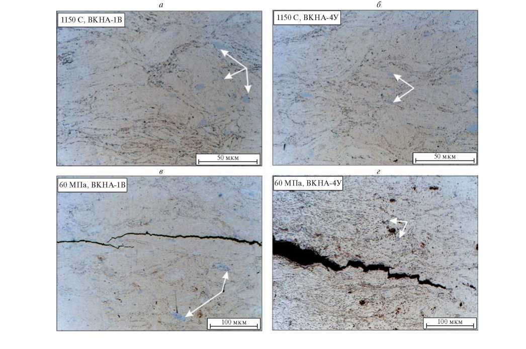 Анализируя снимки структуры образцов из сплавов ВКНА (рис. 2), полученных методом SPS при различных режимах, можно сделать вывод о том, что их структура неоднородная. Крупные дефекты в виде трещин (рис. 2в и 2г) обнаружены у компактов двух составов, полученных спеканием при 1100 °C и повышенном давлении прессования (60 МПа). Таким образом, данный режим спекания не подходит для формирования малодефектных заготовок. Для всех исследуемых материалов характерно наличие дефектов в виде микропор. В структуре компактов двух различных составов присутствуют включения, отличающиеся по цвету от основного материала (на рис. 2 выделены стрелками). На снимках структуры спеченного сплава ВКНА-4У, полученных методом РЭМ, области этих включений светлее основного материала (рис. 3а). Аналогичные включения были зафиксированы в ранее опубликованной работе [14]. Представленные в указанной работе карты элементов подтверждают наличие вольфрама в центре светлой области, и вольфрама и молибдена по ее периферии.