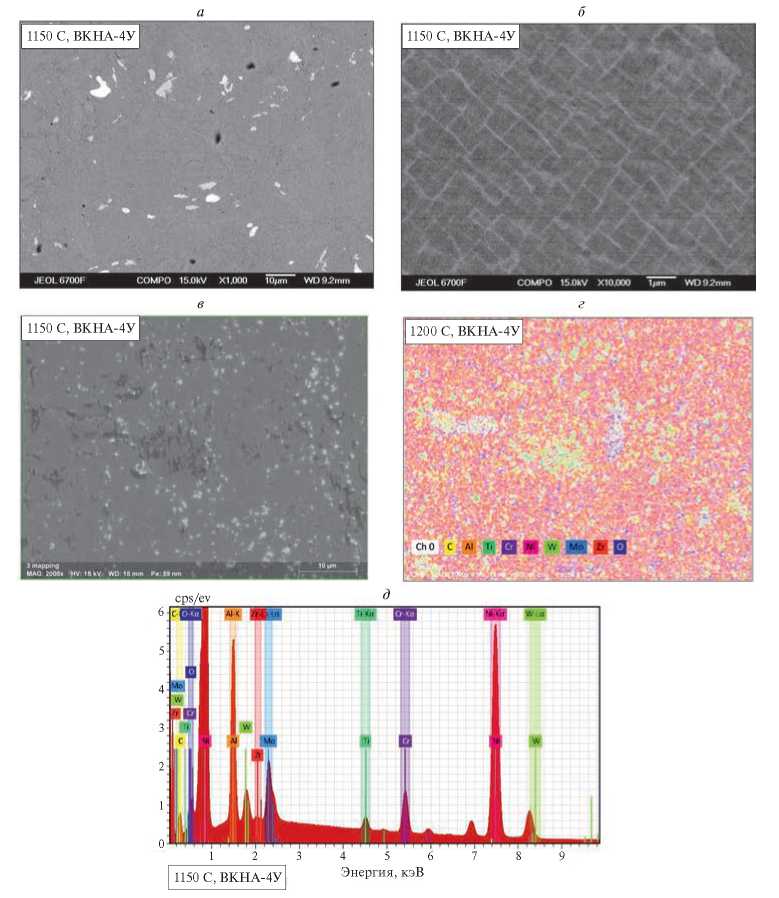 Рис. 3. Структура сплава ВКНА-4У, спеченного методом SPS при 1150 °C и 40 МПа (а–в), и результаты микрорентгеноспектрального анализа (г, д). Растровая электронная микроскопия.