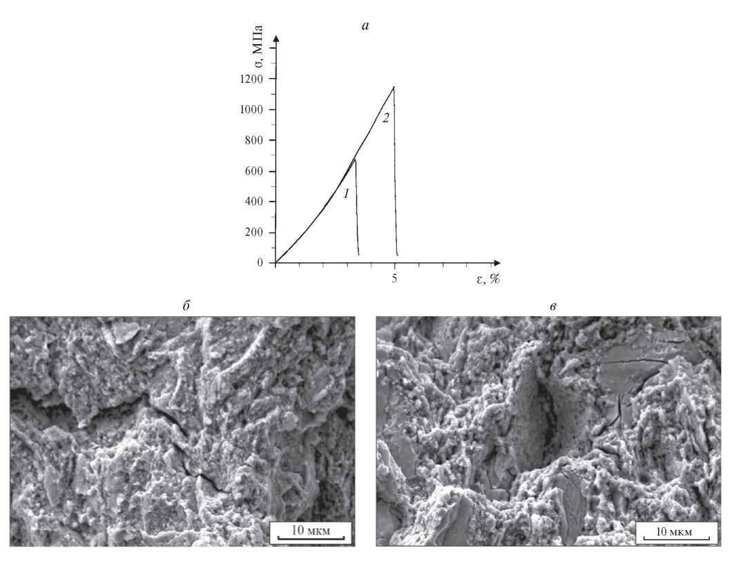 Рис. 4. Кривая (σ – ε) деформации растяжения при температуре испытания 20 °C сплава ВКНА-1В (кривая 1) и ВКНА-4У (кривая 2), полученных методом SPS при 60 МПа (а). Фрактограммы после испытаний на одноосное растяжение спеченного при 60 МПа сплава ВКНА-1В (б); ВКНА-4У (в).