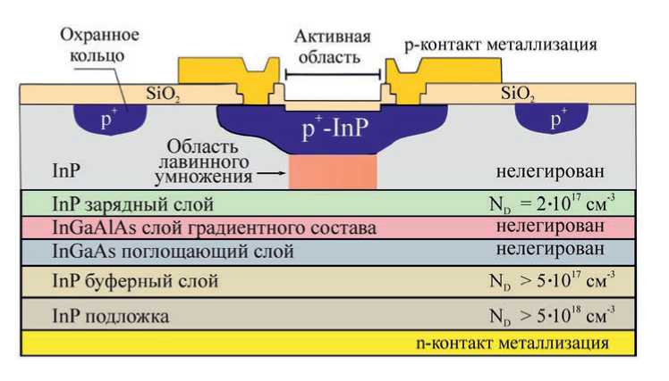 Оптимальная толщина слоя лавинного умножения (определяет вероятность туннельной генерации из ловушек и однородность электрического поля) должна быть около 1 мкм при уровне легирования менее (1–2)×1015 см–3. Оптимальная толщина зарядного слоя n- InP составляет 150–250 нм при концентрации 1×1017 см–3, что соответствует напряжению пробоя 65–45 В.