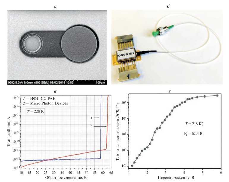 Внешний вид чипа и модуля ОЛФД представлены на рис. 2а и 2б. На рис. 2в приведены сравнительные темновые вольт-амперные характеристики (ВАХ) образцов ОЛФД Института физики полупроводников СО РАН и фирмы Micro Photon Devices (Италия) [24], измеренные при рабочей температуре T = 220 K. Следует отметить, что достигнутый уровень темнового тока (~1.2×10–12 А) для ОЛФД ИФП СО РАН вблизи напряжения пробоя примерно на порядок меньше темнового тока ОЛФД фирмы Micro Photon Devices, что говорит о высоком качестве разработанного устройства.