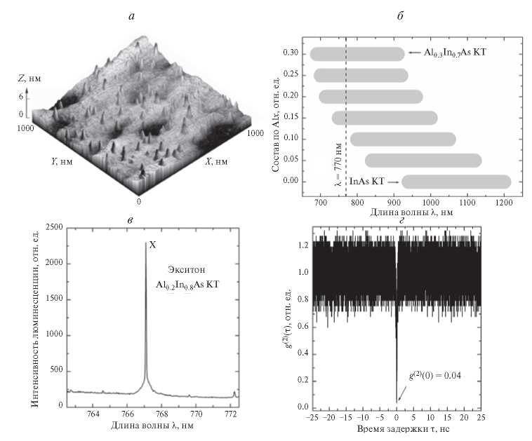 Рис. 3. АСМ – топограмма структуры с Al0.1In0.9As КТ (а), спектральный диапазон излучения AlxIn1–xAs КТ различного состава при T = 295 K (б), cпектр микролюминесценции одиночной Al0.2In0.8As КТ при T = 10 K (в), зависимость g2(t), демонстрирующая субпуассоноский тип статистики излучения КТ (г).