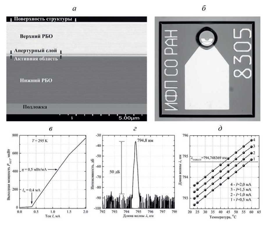 Рис. 4. Исходная лазерная структура, выращенная методом МЛЭ, данные сканирующей электронной микроскопии (a), микрофотография лазерного чипа 300х300 мкм (б), ватт-амперная характеристика ЛВР (в), спектр излучения лазера (г), зависимости генерационной длины волны ЛВР от температуры и тока накачки (д).
