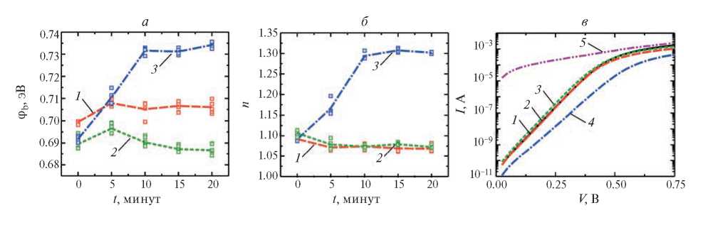 Отжиг при температурах 300 (кривая 1) и 350°C (кривая 2) схожим образом воздействует на параметры БШ (рис. 1а и 1б). После 5 мин отжига наблюдается увеличение φb на 0.1 эВ, при этом n уменьшается до значений 1.06–1.09. При последующем отжиге (10–20 мин) при 300 °C φb практически не изменяется, а при 350 °C плавно уменьшается до изначального значения 0.69 эВ. При этом n не изменяется для обеих температур. При повышении температуры отжига до 400 °C (кри вая 3) в первые 5–10 мин наблюдается линейный рост параметров φb и n до значений 0.73 эВ и 1.3 соответственно. Далее (10–20 мин) параметры значительно не изменяются. На рис. 1в в полулогарифмическом масштабе приведены характерные прямые ветви ВАХ исходных (кривая 1) и отожженных в течение 20 мин при различных температурах (кривые 2–5) структур с БШ. Внешний вид ВАХ существенно не изменяется при температурах отжига до 350 °C включительно, а при 400 °C значение тока уменьшается на порядок и наблюдается увеличение наклона прямой, что связано с повышением φb и n. Для 450 °C отжига параметры не рассчитывались поскольку уже через 5 мин происходила деградация БШ.