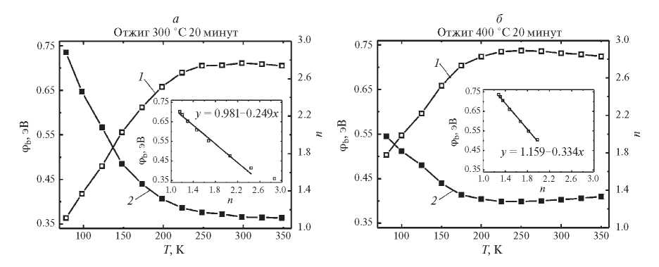 Для изучения влияния отжига на неоднородность БШ были измерены I–V–T зависимости (80–350 К) для образцов с БШ не подвергавшихся отжигу и отожженных при температурах 300°C (рис. 2а) и 400°C (рис. 2б) в течение 20 минут. На рис. 3 представлены соответствующие данным образцам зависимости параметров φb и n от температуры [φb-T (кривая 1) и n-T (кривая 2)] для БШ после отжига при 300 (а) и 400 °C (б). Значения φb и n получены при анализе токов в диапазоне 10–10–10–5 А. Зависимости для БШ до отжига существенно не отличаются от структур, отожженных при 300 °C, и поэтому не представлены. Таким образом, отжиг при 300 °C продолжительностью до 20 минут не приводит к существенным изменениям количества (площади) неоднородностей и/или высоты их локального барьера по сравнению с исходными БШ. В совокупности с данными работы [7] можно сделать вывод, что неоднородность в этом случае преимущественно определяется ростовыми структурными дефектами на исходной поверхности InAlAs.