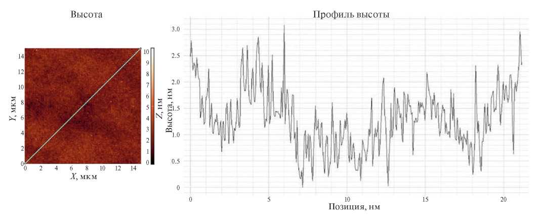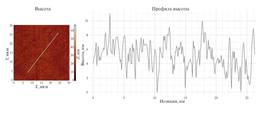Шероховатость поверхности образцов КЦТ в ходе отработки режимов и исследования возможностей различных типов предфинишных полировальных суспензий измерялась на атомно-силовом микроскопе Ntegra Maximus (Россия). Согласно результатам измерений, на длине 26 мкм средняя арифметическая шероховатость поверхности составила Ra = 1.55 нм, а среднеквадратическая – rms = 1.93 нм (см. рис. 1).