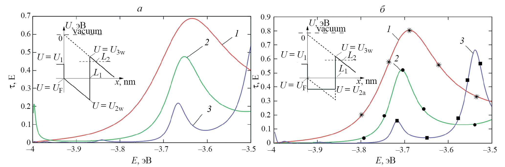 где U5 = EF — уровень Ферми металлического катода, U6 — уровень Ферми CNT, точка L3 находится на таком расстоянии от L2, чтобы выполнялось ассимптотическое разложение функции Эйри (см. [28], рис. 2). На рис. 2б показана расчетная зависимость функции пропускания от энергии E для случая, когда мы аппроксимируем потенциальную энергию в нанотрубке (штриховая линия на вставке, рис. 2) мелкой прямоугольной потенциальной ямой (сплошная линия на вставке, рис. 2). Из результатов расчетов, которые приведены на рис. 2, следует полное совпадение с результатами работ (см. [16, 29], рис. 3б): на рис. 2 кривые 1, 2 и 3 — это результаты наших расчетов, полученные с помощью реализованной программы, маркеры «звездочка», «круг» и «квадрат» представляют собой результаты расчетов, полученные в [16]. Результаты, приведенные на рис. 2a, незначительно отличаются количественно по сравнению с результатами, показанными на рис. 2б. Существует также небольшое качественное отличие: сдвиг максимумов по горизонтали, в результате чего на рис. 2a в отличие от рис. 2б не видно вершины третьего максимума. Такое отличие объясняется тем, что на рис. 2a для случая внешнего электрического поля используется зависимость для потенциальной энергии с треугольным профилем. Следует отметить, что отличие потенциалов в данной работе (см. врезки на рисунках 2a и 2b) приводит к тому, что функции прохождения τ(E) смещаются друг относительно друга вдоль оси энергии E.