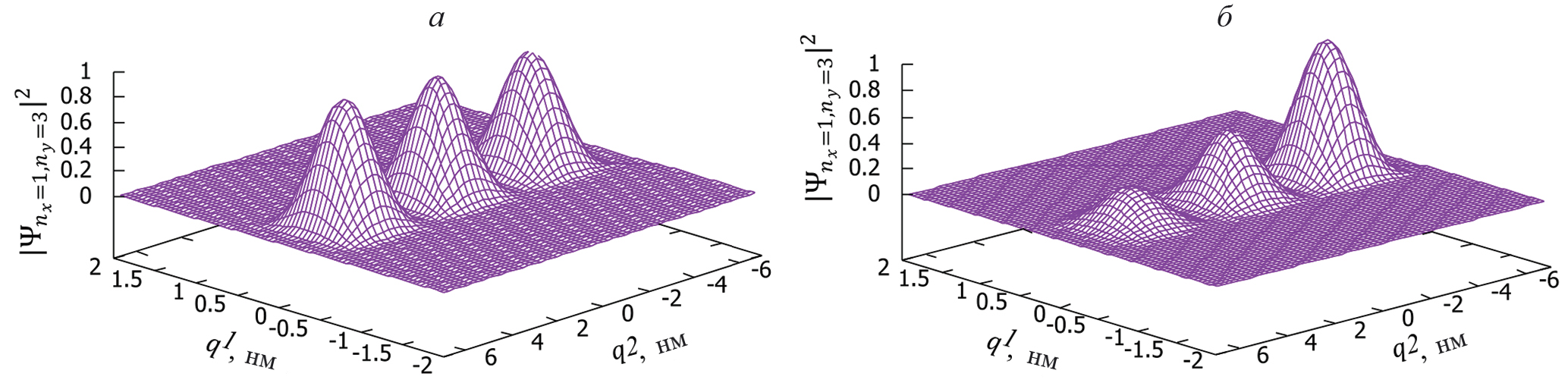 с краевыми условиями аппроксимировать неявной двухслойной разностной схемой и реализовать итерационный процесс, то решение волновой функции в результате последовательных итераций сходится к функции стационарного состояния. В (10) поле W направлено вдоль продольной координаты q2, где L = 10H и H = 1.23 нм есть длина и ширина наноленты, кручение наноленты, E = const — параметр сдвига. На рис. 4a показана зависимость волновой функций стационарного состояния при nx = 1 и ny = 3 от поперечной q1 и продольной q2 координат, соответственно, в скрученной наноленте при отсутствии продольного электрического поля W с учетом поверхностного потенциала для частиц. На рис. 4б, приведена аналогичная зависимость при наличии продольного электрического поля W = 108 В/м.