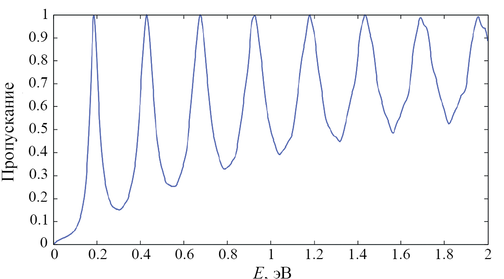 На рис. 3 приведена расчетная зависимость коэффициента прохождения от энергии E для периодической потенциальной ямы U(x)