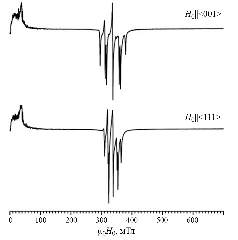 Рис. 1. Спектры ЭПР монокристаллического образца Pb1-x-yGdxCuyS, зарегистрированные в ориентациях <001>ǁ→H0 и <111>ǁ→H0 (fmw = 9419±1 МГц, T = 5 К, Pmw = 2 мВт).