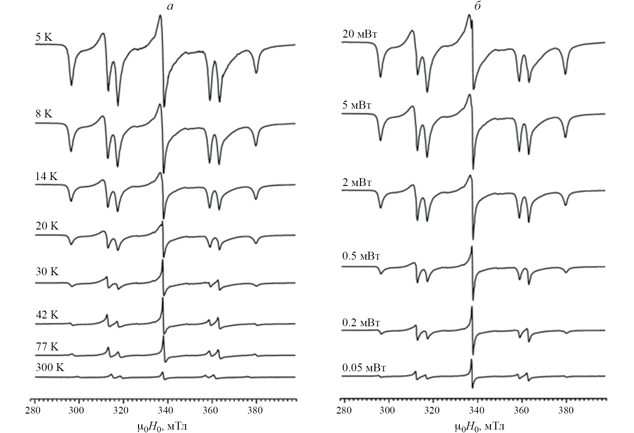 Естественно, что, глядя на формы линий, представленных на рис. 2, возникает подозрение о неправильной настройке системы автоматической подстройки частоты (АПЧ) резонатора спектрометра. Поэтому здесь были выполнены тестовые регистрации спектров при целенаправленной расстройке системы АПЧ в пределах, которая оказалась возможным для используемого спектрометра ЭПР. Однако, заметных изменений в спектрах ЭПР, зарегистрированных при значениях мощности и температуры в соответствии с рис. 2, не было обнаружено. Более того, в записях при отключенной системе АПЧ были обнаружены небольшие изменения только в случаях высокого значения микроволновой мощности Pmw = 20 мВт.