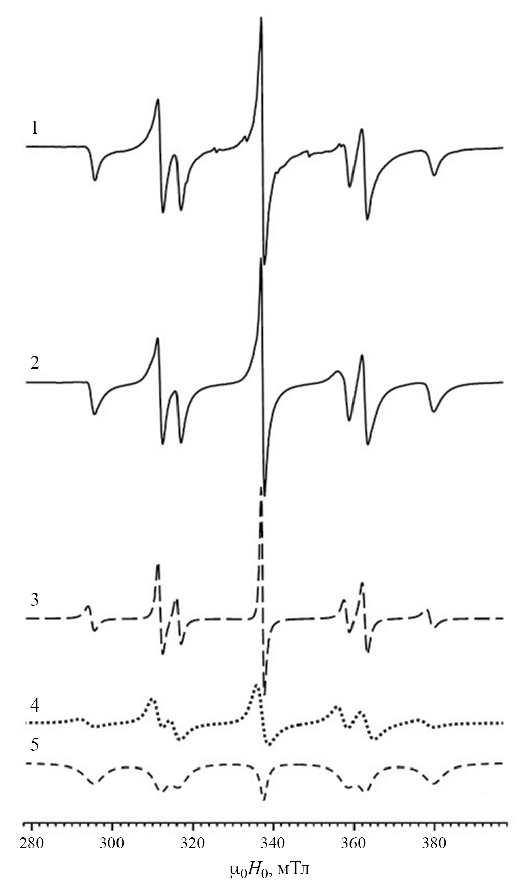Компонентами симулированного спектра 2 являются три теоретических спектра, потребовавшихся для описания очертаний наблюдаемого спектра 1. Линии спектров 3 и 4 построены в соответствии с формулой (3). Линиям спектра 5 соответствует не первая производная функции Лоренца, а сама эта функция, но взятая с отрицательным знаком (форма «перевернутый колокол»). Параметры формы линий спектров 3—5 приведены в табл. 2.