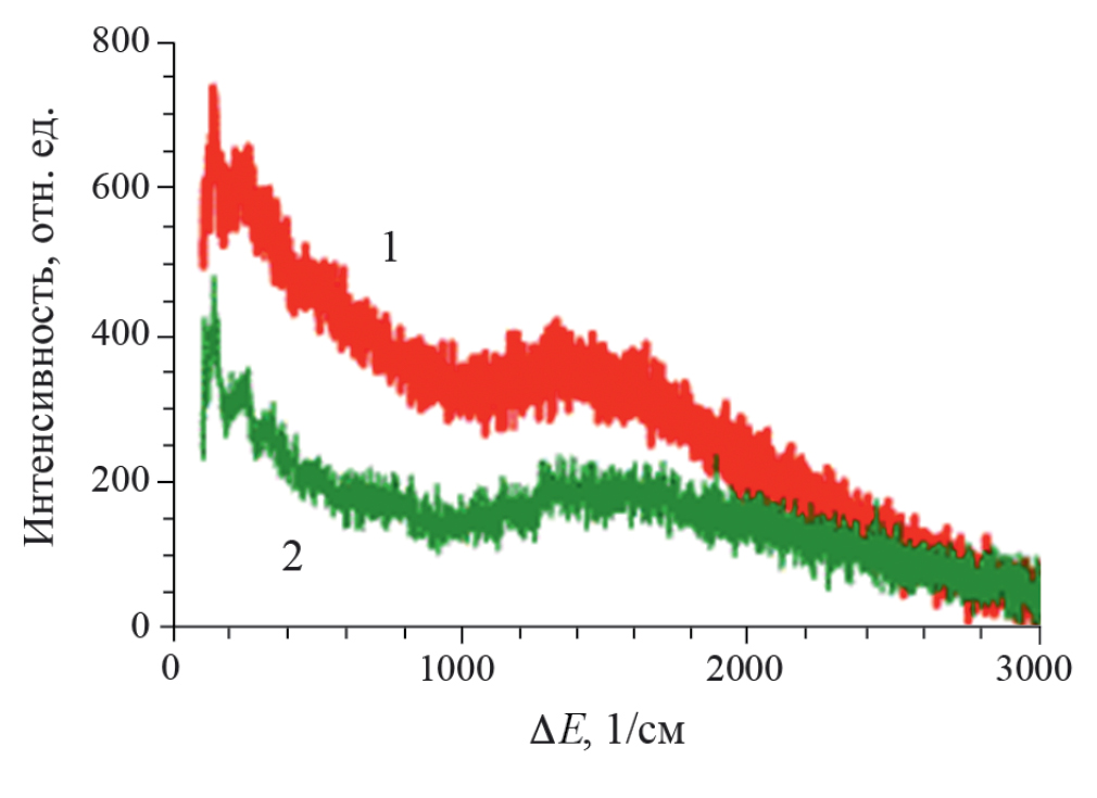 Рис. 1. Спектры КРС чистой титановой фольги (1) и фольги после облучения на воздухе электронным пучком установки ЭЛА с дозой 1 ГГр (2).