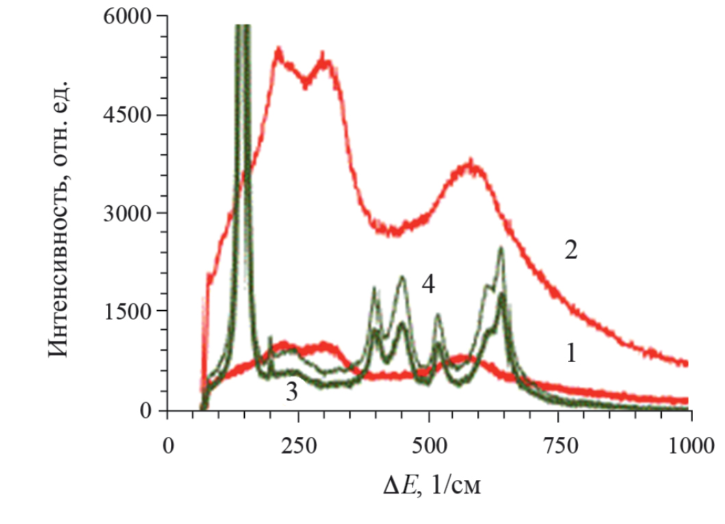 Пара спектров 3 и 4 на рис. 3 принадлежат одной Ti фольге, отработавшей на установке ЭЛА в контакте с газовой смесью KrF-ЭПЛ. Спектр 3, приводившийся ранее в [21], получен на приборе с возбуждающим лазером на 532 нм, а 4 — на 785 нм. У спектров 3 и 4 структура в области существенно отличается от структур на спектрах 1 и 2 при незначительной разнице общих интенсивностей, которые более чем на порядок выше интенсивностей исходного спектра (рис. 1). В спектрах 3 и 4 угадывается наличие полосы в области 910 см-1, но ее выделение требует специфических методов анализа спектров КРС [21] не гарантирующих высокой точности.