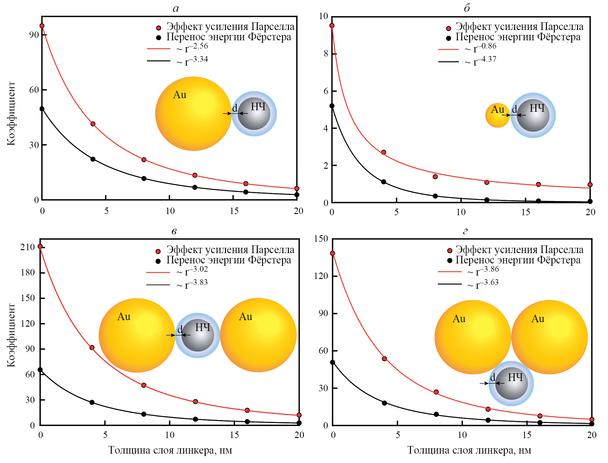 Были построены графики зависимости каждого коэффициента от толщины линкера (ПЭИ). На рис. 2 показаны результаты моделирования. Видно, что при всех толщинах слоя линкера парселловское усиление спонтанного излучения превосходит в несколько раз усиление ферстеровского обмена. Заметим, что степень функции спада ферстеровского усиления с расстоянием оказалась не больше 4. Связано это с тем, что золотая частица не является точечным объектом, следовательно, она поглощает фотоны люминесценции ионов тербия всем своим объемом. Для того чтобы проверить это, было смоделировано взаимодействие люминофора с золотой частицей меньшего радиуса. Показатель степени увеличился (рис. 2б), тем самым подтвердив причину менее слабой зависимости коэффициента Ферстера от расстояния.