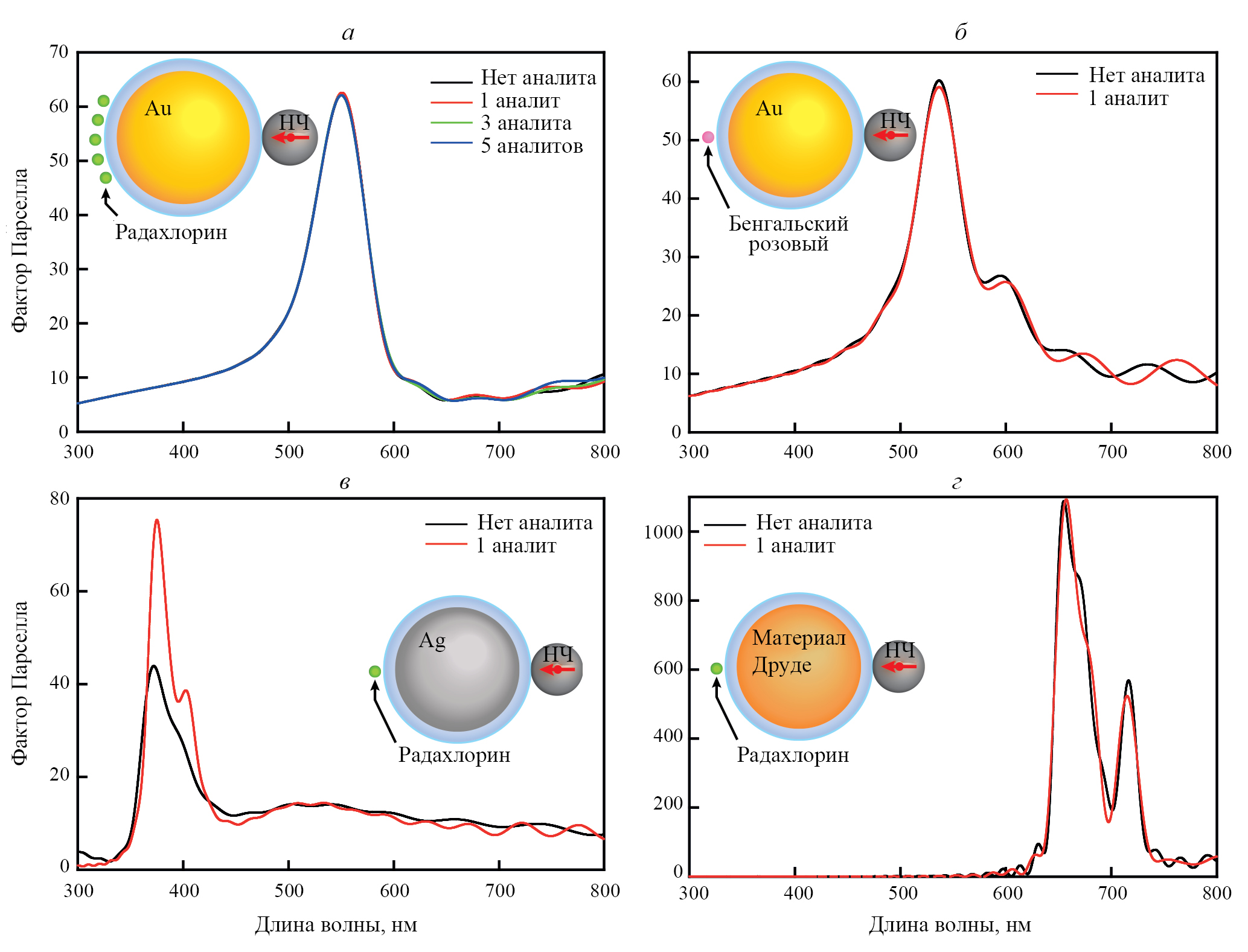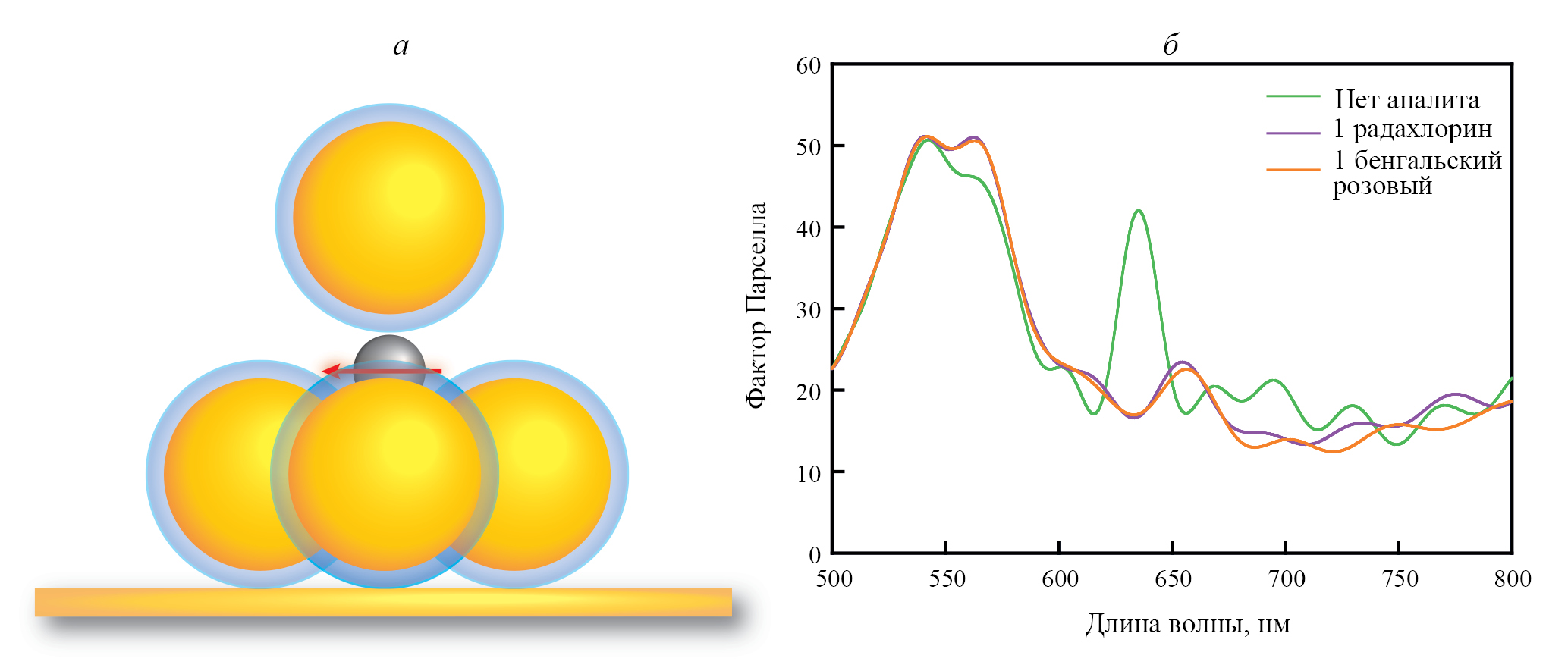 5 золотых наночастиц располагались на поверхности золотой подложки, образуя правильную четырехугольную пирамиду, люминофор находился в центре пирамиды. Внутри пирамиды из золотых наночастиц вблизи люминофора располагается сфера аналита. Схематичное изображение конфигурации системы (вид сбоку) представлено на рис. 4а. Моделирование проводилось для случаев отсутствия аналитов, а также наличия аналитов обоих видов. На рис. 4б приведены коэффициенты Парселла для всех трех случаев. Видно, что присутствие одной молекулы каждого типа приводит к модификации плотности электромагнитных состояний. Причина этого кроется в том, что данная геометрия кластера наночастиц поддерживает несколько мод плазмонного резонанса. Например, радахлорин также имеет переходы в красно-оранжевой части видимого спектра, что приводит к заметному влиянию на коэффициент Парселла в этой части спектра.