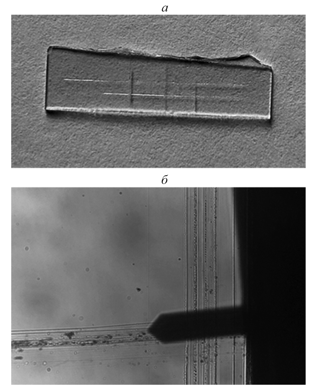 Рис. 1. Полученные в оптическом микроскопе изображения: стеклянной подожки длиной 20 мм с нанесенной системой меток (а), меток на подложке и балки АСМ зонда, подведенного к поверхности, ширина балки 30 мкм (б).
