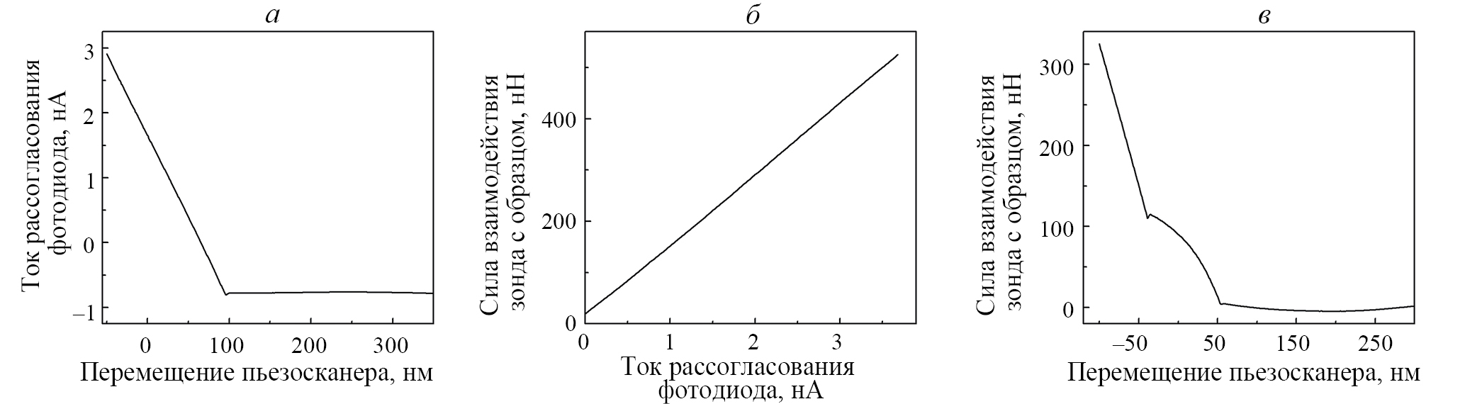 При работе в контактном режиме постоянная сила взаимодействия зонда с поверхностью поддерживается за счет отклонения балки кантилевера зонда от положения равновесия на заранее заданную величину. Для этого используются лазер и четырехсекционный фотодиод. Луч лазера отражается от обратной стороны кантилевера и попадает на фотодиод. Сигнал, снимаемый с фотодиода, пропорционален току, этим током задается сила взаимодействия зонда с поверхностью [11]. Для того чтобы оценить силу взаимодействия необходимо ток рассогласования между верхними и нижними секциями фотодиода пересчитать в расстояние, на которое отклоняется балка с зондом. Обычно такая оценка осуществляется путем записи силовых кривых подвода зонда к поверхности, при этом по оси абсцисс отложено вертикальное перемещение пьезосканера, а по оси ординат — ток рассогласования между двумя верхними и двумя нижними секциями фотодиода. Предполагается, что подложка и зонд достаточно твердые и не деформируются при надавливании. При сближении зонд соприкасается с поверхностью, и силовая кривая начинает линейно расти вверх (рис. 2а). В этом случае можно с хорошей точностью предположить: на сколько изменилось положение пьезосканера по вертикальной оси, на столько же изменилось положение зонда, и значит сигнал тока рассогласования с фотодиода прямо пропорционален перемещению (рис. 2б). Рассчитанная таким образом сила взаимодействия зонда HA_NC/FD Etalon с поверхностью составила около 300 нН при стандартном значении тока рассогласования 2 нА. Как показали выполненные эксперименты, при сканировании поверхности с такой силой взаимодействия АНЧ всегда сдвигаются. Из-за особенностей работы обратной связи АСМ Solver-Bio в контактном режиме снизить силу взаимодействия с образцом для зондов HA_NC/FD Etalon больше, чем в 2 раза не получается. Использование зондов CSG11 с меньшей силовой константой позволило уменьшить силу взаимодействия в 60 раз до 5 нН, однако даже в этом случае в процессе сканирования АНЧ сдвигались.