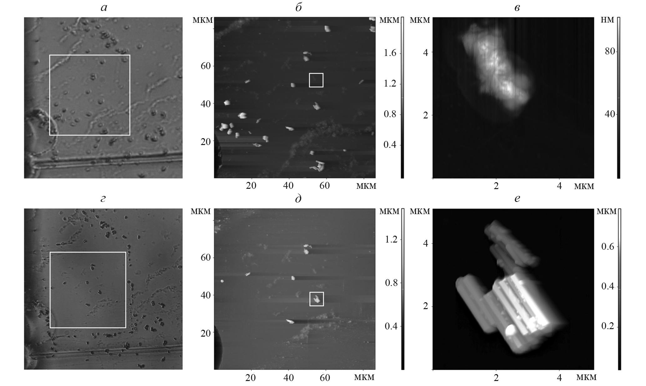 Рис. 3. Оптические изображения стеклянной подложки с осажденными наночастицами NaYF4:Yb, Er до (а) и после (г) очистки поверхности от лишних наночастиц. Соответствующие АСМ изображения этой области до (б) и после (д) очистки. АСМ изображения остатков раствора (в) и агломерата наночастиц (е). Соответствующие области сканирования показаны рамкой.