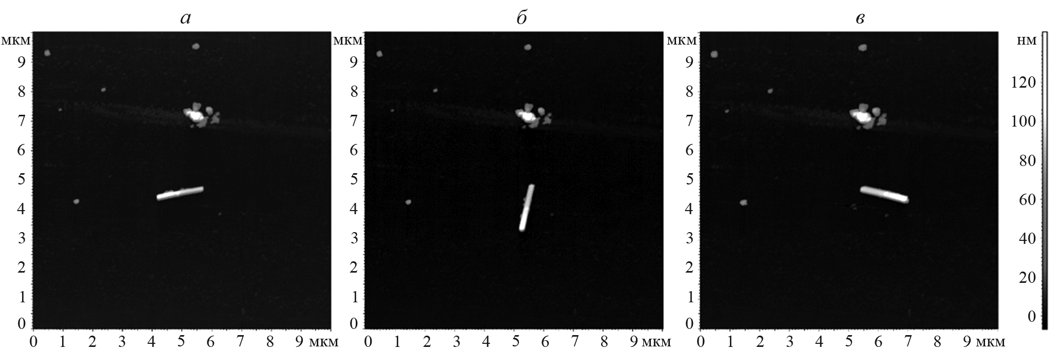 Для поворота АНЧ на определенный угол использовали тот же подход, что при очистке поверхности. Отличие было в том, что при этом сдвигалась не вся частица, а только один из ее концов на расстояние, сопоставимое с размерами частицы. Например, для поворота АНЧ из положения на рис. 4а в положение на рис. 4б в контактном режиме было выбрано прямоугольное поле сканирования «по вертикали, сверху вниз» с начальной точкой {3.5, 5.5} (здесь и далее координаты даются в формате {X, Y}, где X, Y — числа в мкм, отложенные по горизонтали и вертикали сканов на рис. 4 соответственно) и конечной точкой {5.2, 3.0}. Число вертикальных линий сканирования составляло 300, скорость сканирования — 5 мкм/с, сила давления зонда — 2 мкН. После проведения ОКМ исследований частицу поворачивали еще раз и угол поворота составил 156° относительно первоначального положения частицы.