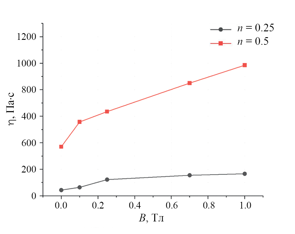 При большей концентрации СНЧ растет начальное значение вязкости МЖ, и магнитореологический эффект также более выражен (рис. 3). Для СНЧ длиной 9 мкм наблюдается увеличение вязкости в 2.5 раза по сравнению с начальной вязкостью МЖ и =0 Тл.