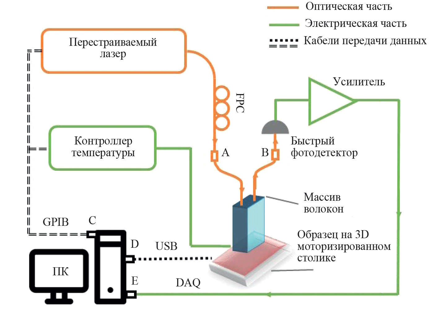 Рис. 1. Схематическое изображение экспериментальной установки для измерения спектра пропускания. Синим цветом, показан путь оптических волокон, серым, электрический, черным, удаленное управление лазером.