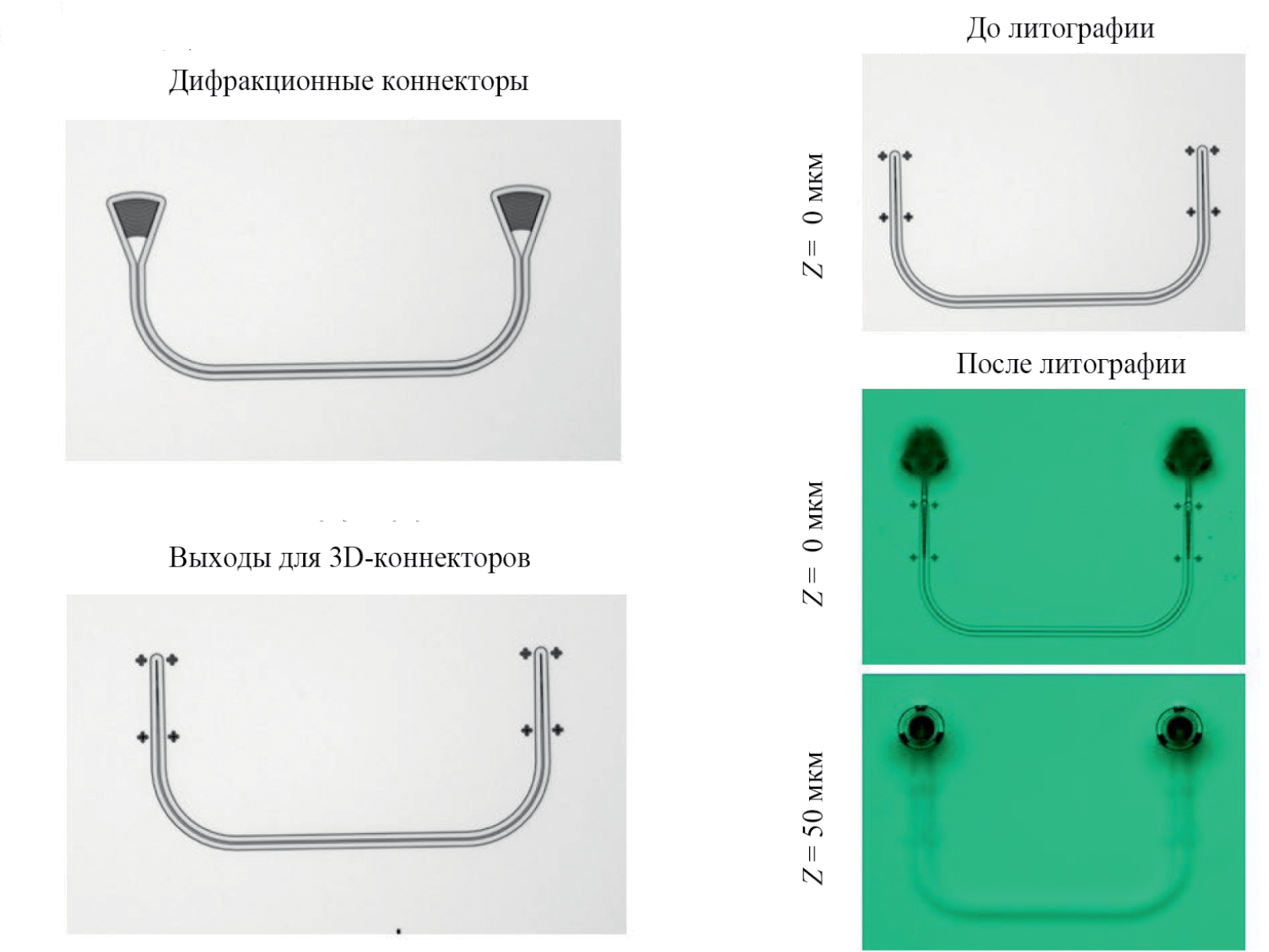 Рис. 3. Изображения фрагментов чипа для исследования эффективности ввода оптических коннекторов, полученные с помощью методов оптической микроскопии. Изображения дифракционных конвекторов и входов для 3D-микроструктур до поведения DLW-фотолитографии (а). Изображения выходов для 3D коннекторов до и после прямого (3+1) D лазерного письма (б).