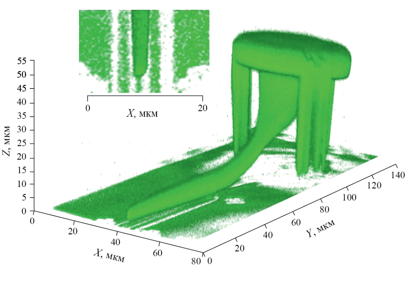 Для исследования морфологии структур и получения карты люминесценции использовали конфокальный микроскоп LSM 510 Meta (Zeiss, Германия) с масляным иммерсионным 40× объективом с числовой апертурой NA=1.3 (Zeiss, Германия) [13]. Возбуждение люминесценции осуществляли аргоновым лазером с длиной волны 458 нм. Для морфологического исследования 3D-микроструктур использовали режим покадрового сканирования и получения Z-стека планарных карт люминесценции. При сканировании размер точечной диафрагмы для конфокальной схемы составлял 100 мкм.