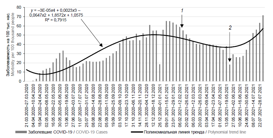 Рис. 5. Заболеваемость COVID-19 в РО в 2020–2021 гг.1 — первый случай выделения от больного геноварианта B.1.1.7 COVID-19;2 — первый случай выделения от больного геноварианта B.617.2 COVID-19.