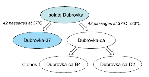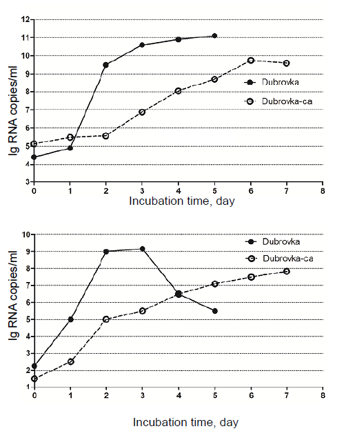 The Dubrovka-37 variant did not replicate in the Vero cell culture at 23ºC, while the Dubrovka-ca, Dubrovka-ca-B4, and Dubrovka-ca-D2 variants on the 7th day reached the titer of 4.5–8.0 TCID50/ml, depending on MOI.
