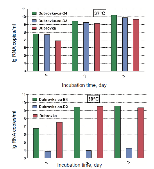 Fig. 5. Accumulation of the viral RNA in the Vero cell culture after the infection with the Dubrovka strain and Dubrovka-ca-B4 and Dubrovka-ca-D2 variants at the culture temperature of 37ºC or 39ºC.The cells were infected at MOI = 0.001; samples of the culture liquid were collected daily, and the concentration of the viral RNA was measured. The results of 2 independent tests are presented as mean values.
