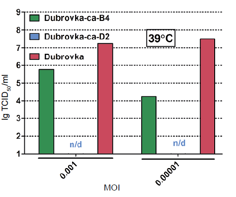 Fig. 6. The virus titer on the 3rd day after the Vero cell culture had been infected with the Dubrovka strain and Dubrovka-ca-B4 and Dubrovka-ca-D2 variants; at the culture temperature of 39ºC and different MOI.The cells were infected with virus variants, and the virus titer was measured in the culture liquid 72 hours after the infection. The results of 2 independent tests are presented as mean values. n/d — not detected.