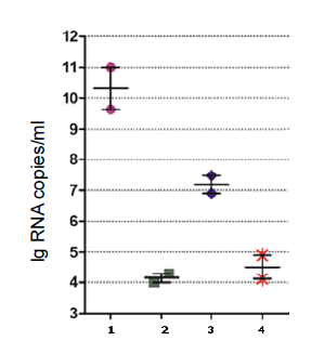Fig. 7. Concentration of the viral RNA in Calu-3 cells infected with SARS-CoV-2 variants, the 3rd day after the infection, at MOI 0.001.1 — Dubrovka strain (the 2nd passage); 2 — Dubrovka-ca-B4; 3 — Dubrovka-ca-D2; 4 — Dubrovka-37. The results of 2 independent tests are presented as mean values.