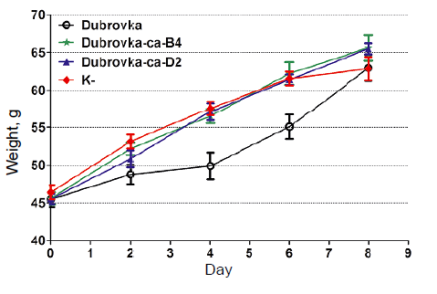 Fig. 8. Kinetics of the weight of hamsters infected intranasally with the Dubrovka strain and Dubrovka-ca-B4 and Dubrovka-ca-D2 variants.From the 0th to the 4th day — n = 9 per group; from the 6th to the 8th day — n = 5 per group. The infective dose — 4.0 lg TCID50. K– — non-infected hamsters.