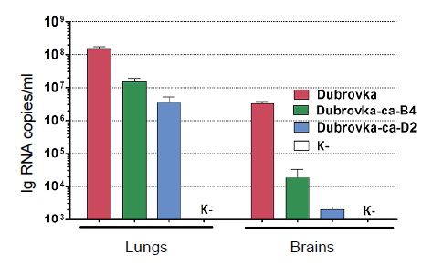 Fig. 9. Concentration of the viral RNA in lung and brain homogenates from hamsters infected intranasally with the Dubrovka strain and Dubrovka-ca-B4 and Dubrovka-ca-D2 variants, 4th day after the infection.n = 4 per group. K– — non-infected hamsters.