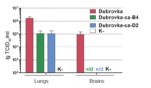 Fig. 10. The virus titer in lung and brain homogenates from hamsters infected intranasally with the Dubrovka strain and Dubrovka-ca-B4 and Dubrovka-ca-D2 variants, the 4th day after the infection.n = 4 per group. K– — non-infected hamsters.