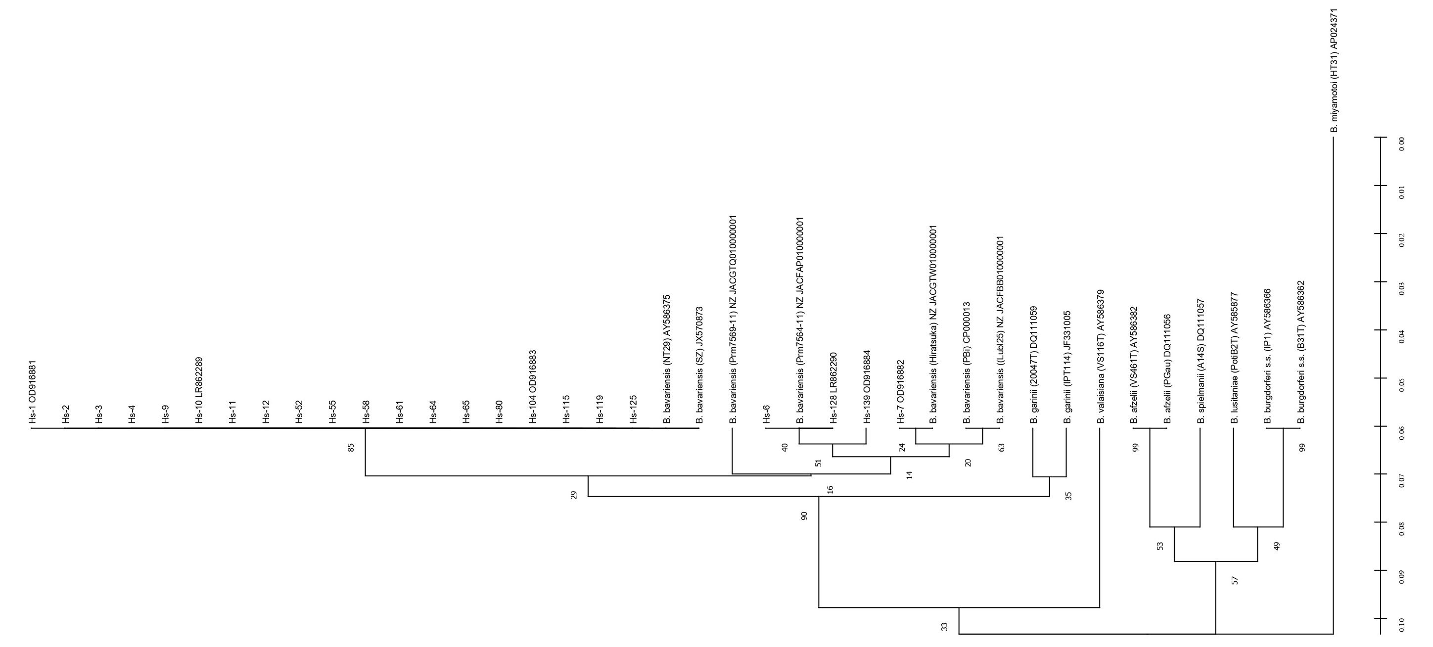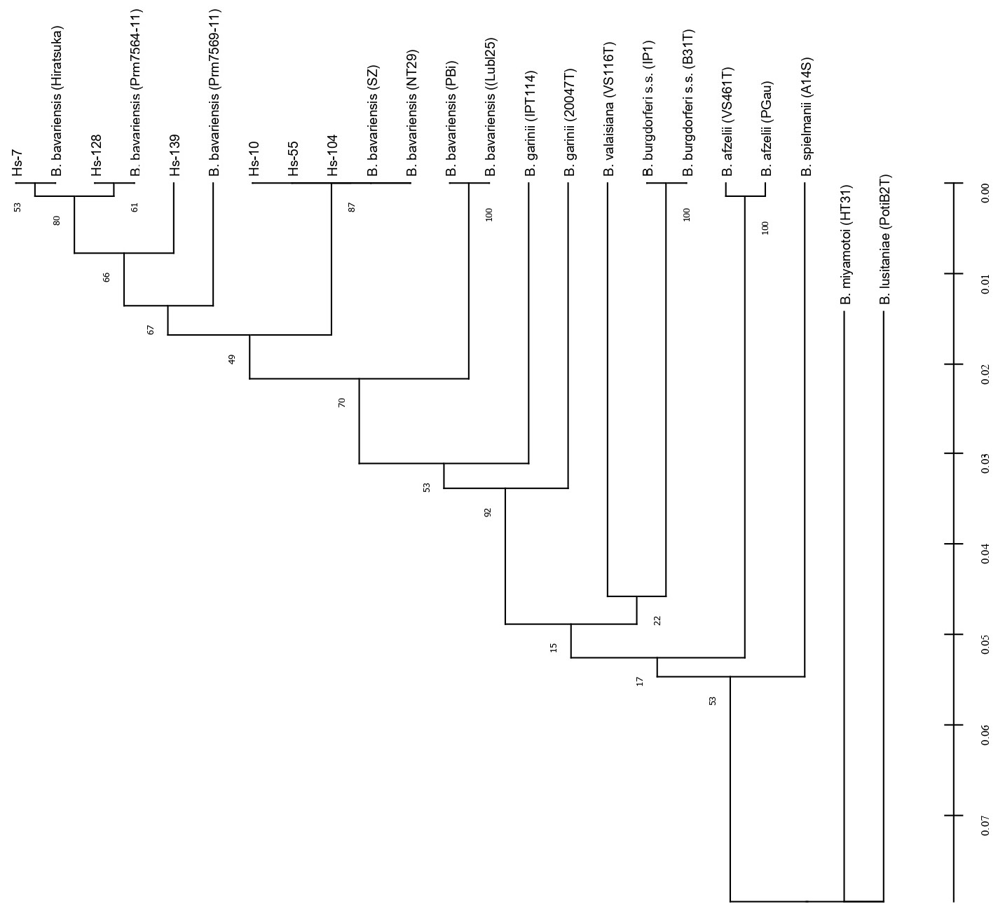 Hs-7 | Hs-10 | Hs-55 | Hs-104 | Hs-128 | Hs-139 | B. garinii 20047T | B. bavariensis | B. spielmanii A14S | B. burgdorferi s. s. B31T | B. lusitaniae PotiB2T | B. valaisiana VS116T | B. afzelii VS461T | |||||