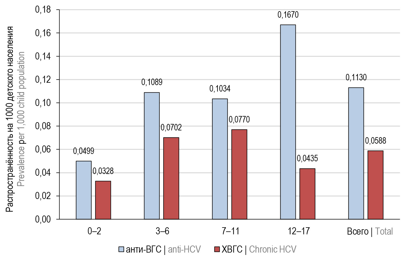 3. In MR, on 01.06.2022, the CHCV infection incidence per 100,000 children of the respective age is 3.3 among children under 3 years of age; 7.0 — among children aged 3–6 years; 7.7 — among children aged 7–11 years; 4.4 — among adolescents over 12 years of age.