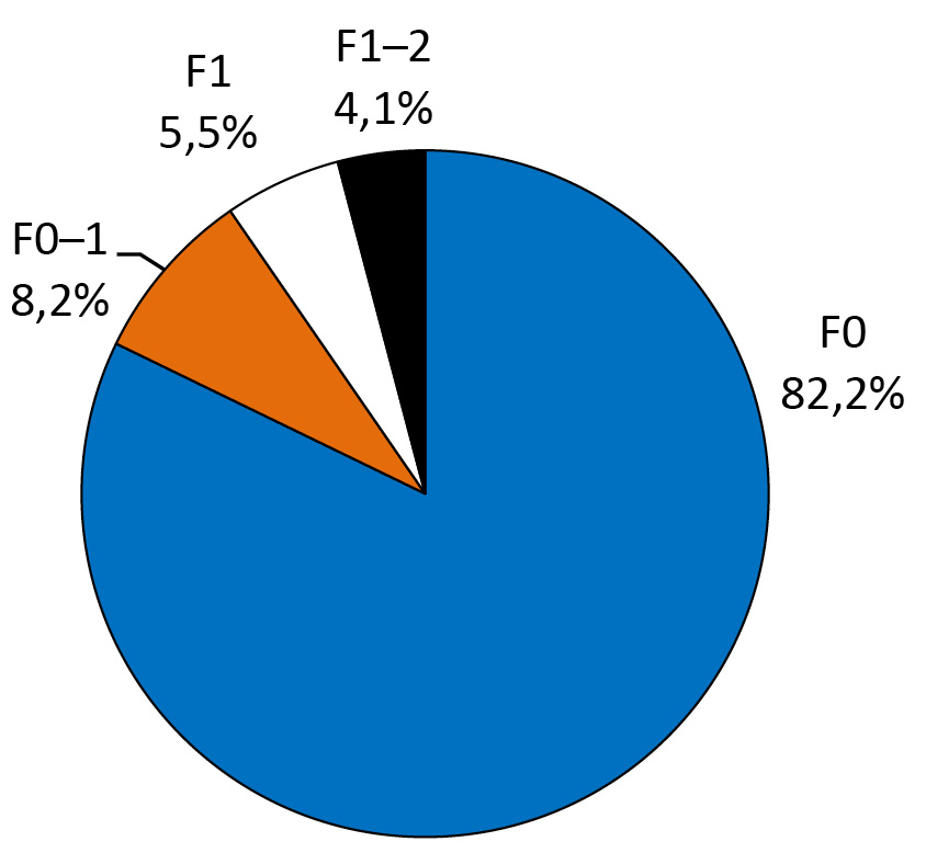 4. Viremic HCV was confirmed in 90.2% [84.6–94.3%] of the examined children, including CHCV infection – in 53.4% [45.0–61.6%], chronic liver disease caused by HCV was confirmed in 35.8% [28.1–44.1%], being mostly mild and having occasional consequences caused by infection with dominant genotypes (LF METAVIR score F1 and F1–2 — in 17.2% [9.8–28.5%]). No significant clinical and epidemiological differences between the natural course of CHCV infection and liver disease were found.