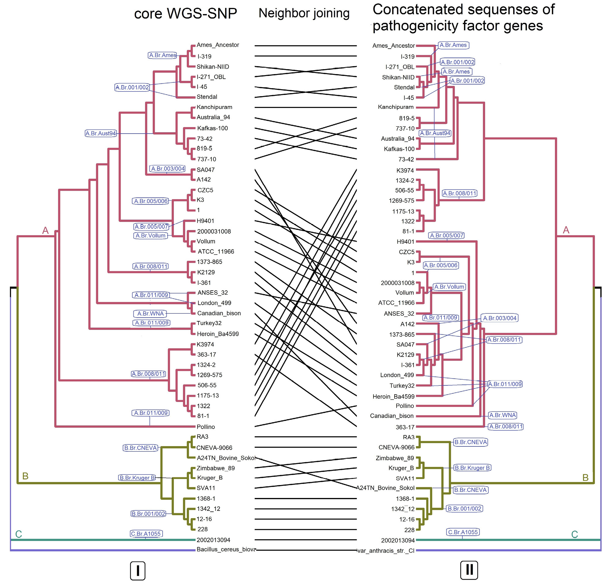The dendrogram based on SNPs of pathogenicity factor genes also shows three universally recognized major genetic lineages: A, B, C of B. anthracis and the clade of the B. cereus biovar anthracis strain; the latter is basic for all the three major genetic B. anthracis lineages, while the clade of lineage C is basic for lineages B and C (Fig. 1). These findings support the idea of the evolution of B. anthracis from its predecessor B. cereus to lineage C and then to lineages B and C; they can also suggest that variability of pathogenicity factor genes can be seen as a driving force of the evolution.