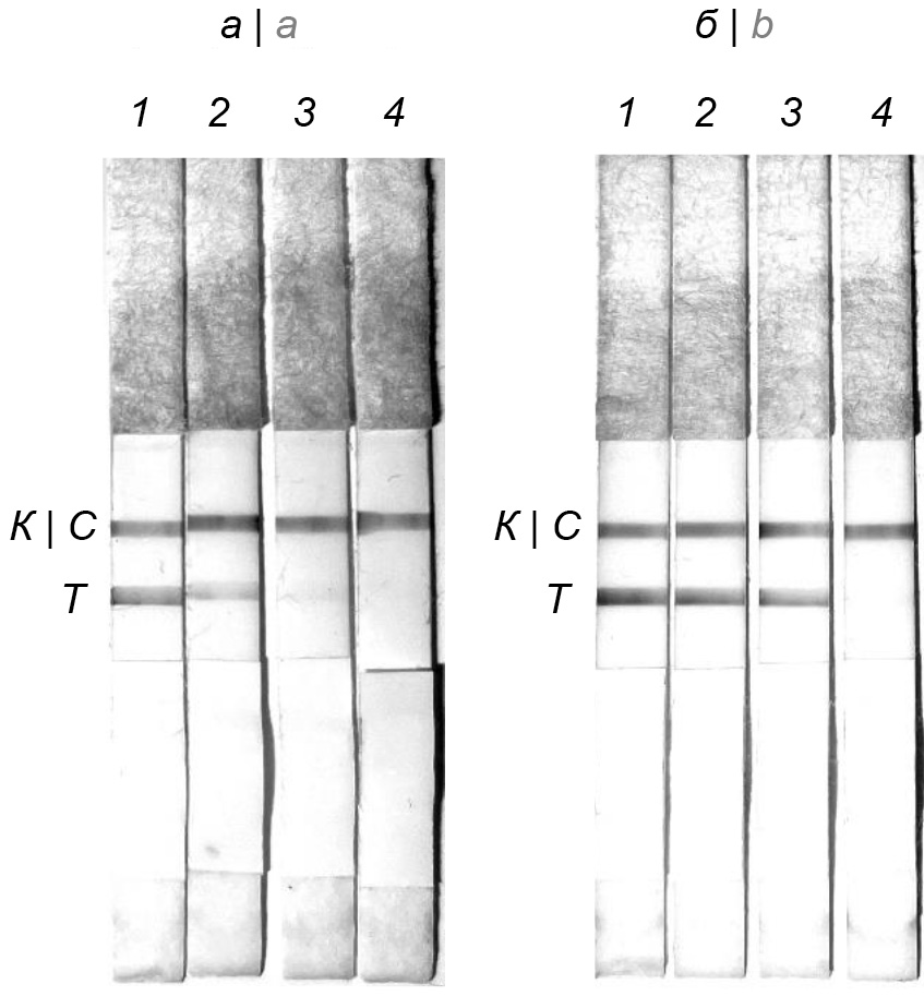 Рис. 2. Результат ИХ-тестирования фильтрата образцов почвы до (а) и после (б) иммуномагнитной сепарации клеток F. tularensis. 1 — 1 × 108 м.к.; 2 — 1 × 107 м.к.; 3 — 1 × 106 м.к.; 4 — 1 × 105 м.к. — количество микробных клеток в 1 г почвы; К — контрольная зона; Т — тестовая зона. / Fig. 2. The result of IC test of the filtrate of soil samples before (а) and after (b) immunomagnetic separation of F. tularensis cells. 1 — 1 × 108 m.c.; 2 — 1 × 107 m.c.; 3 — 1 × 106 m.c.; 4 — 1 × 105 m.c. — the number of microbial cells in 1 g of soil; С — control zone; T — test zone.