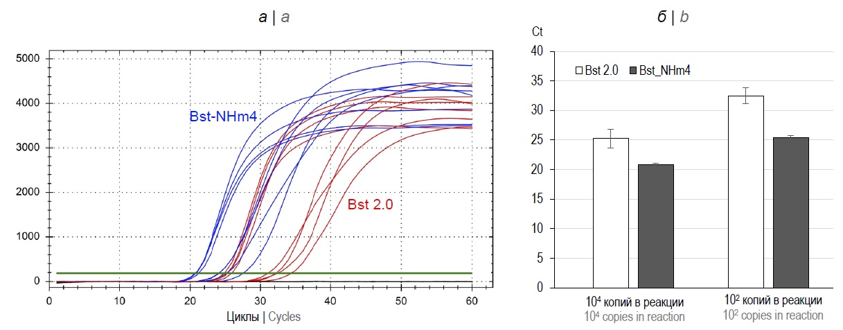 Fig. 4. Assessment of Bst-NHm4 polymerase activity in the model system. a — product accumulation curves; b — mean cycle threshold value.