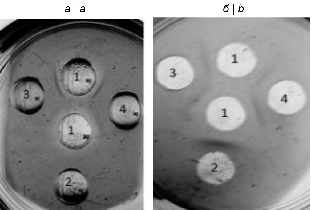 К электрофоретическим фракциям были получены кроличьи иммунные поликлональные сыворотки, которые использовались для постановки РИД с КФ B. anthracis 575/122 R01. Иммунопреципитаты к белкам S-слоя образовывались через 2 ч (рис. 2, а), а к ПА — через 18 ч (рис. 2, б).